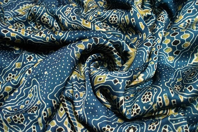 Craft - Ajrakh Hand Block Print Natural Dye Material - Modal Silk SIZE - 2.5 Mtrs Length x 1.12 Mtr Width Feature - Modal Fabric is Hand Printed with Natural Organic/In-Organic dyes through Ajrakh Printing Multi step manual process. Modal Silk fabric is a semi-synthetic fabric made from beech tree pulp. Modal satin fabric is more lustrous, soft, and elastic and renders beautiful drape. - Care Instructions: Normal Wash with Mild Detergent. Wash Seperately for the first time. Occasion - Ethnic and Traditional, Formal, Ethnic Fusion Fashion - Care - Normal Wash with Mild Detergent. Wash Seperately for the first time.