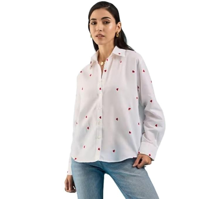 Women's Regular Fit Red Heart Printed Button Down Collar Casual White Shirt.