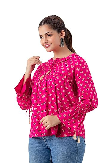 Women's Rayon Classic Printed Small Boota Collarad Fashion Sleeve Top